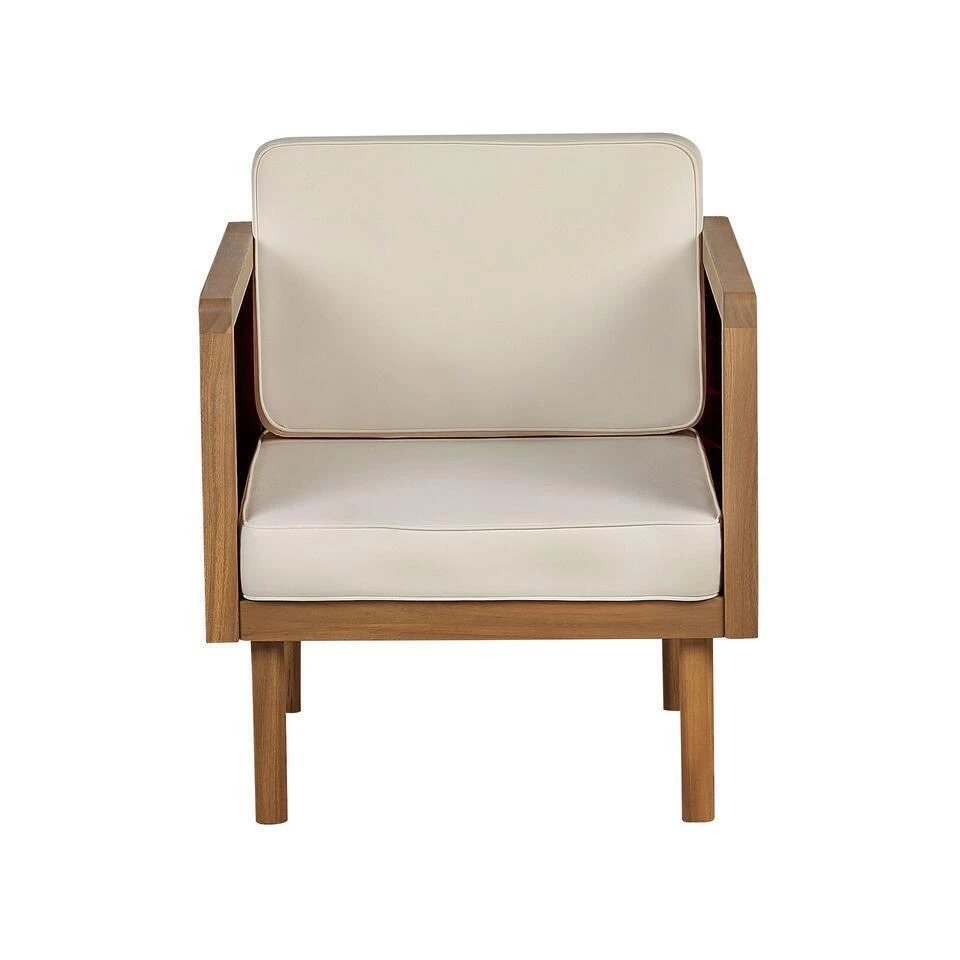 Moderne tuinstoelen set met salontafel. Creëer een moderne en comfortabele ontspanningsruimte op je terras met deze set tuinstoelen met salontafel. De meubels van hoogwaardig acaciahout zijn duurzaam en solide. Ze passen perfect in elke buitenruimte en voegen een natuurlijke uitstraling toe. De meegeleverde crèmewitte kussens bieden de juiste ondersteuning en extra comfort. Geniet van het buitenleven terwijl u ontspant in deze comfortabel zachte tuinstoelen.