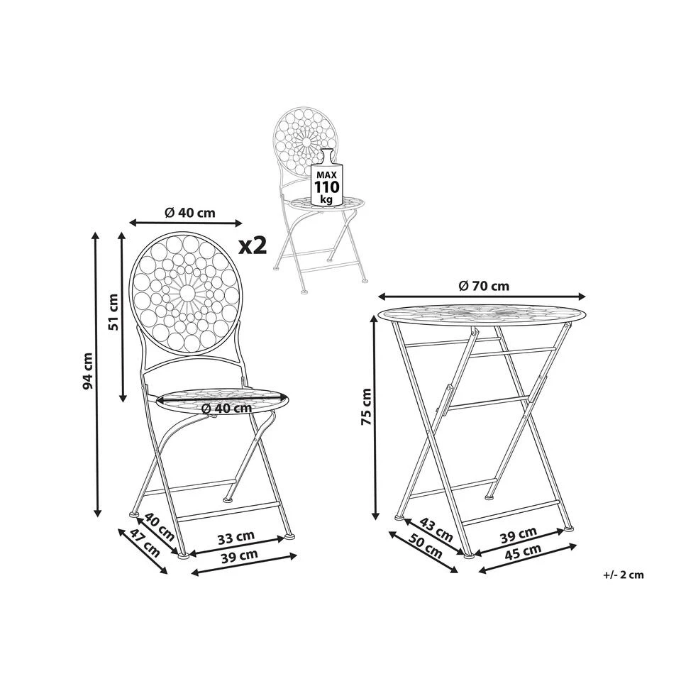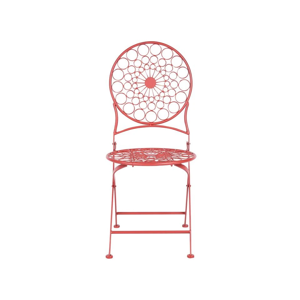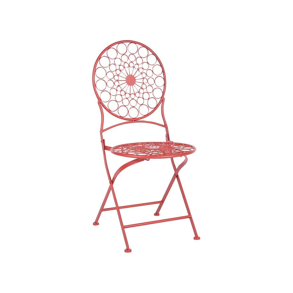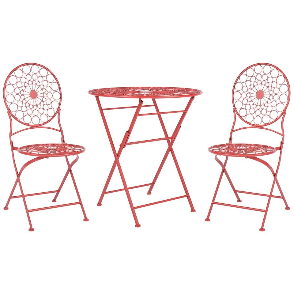 Inklapbare bistroset in Provençaalse stijl. Creëer een romantische sfeer op je balkon of terras met deze charmante tuinset. Hij bestaat uit twee stoelen en een ronde tafel in felle rode kleur. Het prachtige ontwerp is geïnspireerd door de Provençaalse stijl en combineert stijl en functionaliteit. De tafels en de stoelen zijn inklapbaar en de set is compact zodat je hem zelfs in kleine buiten ruimtes kan gebruiken.