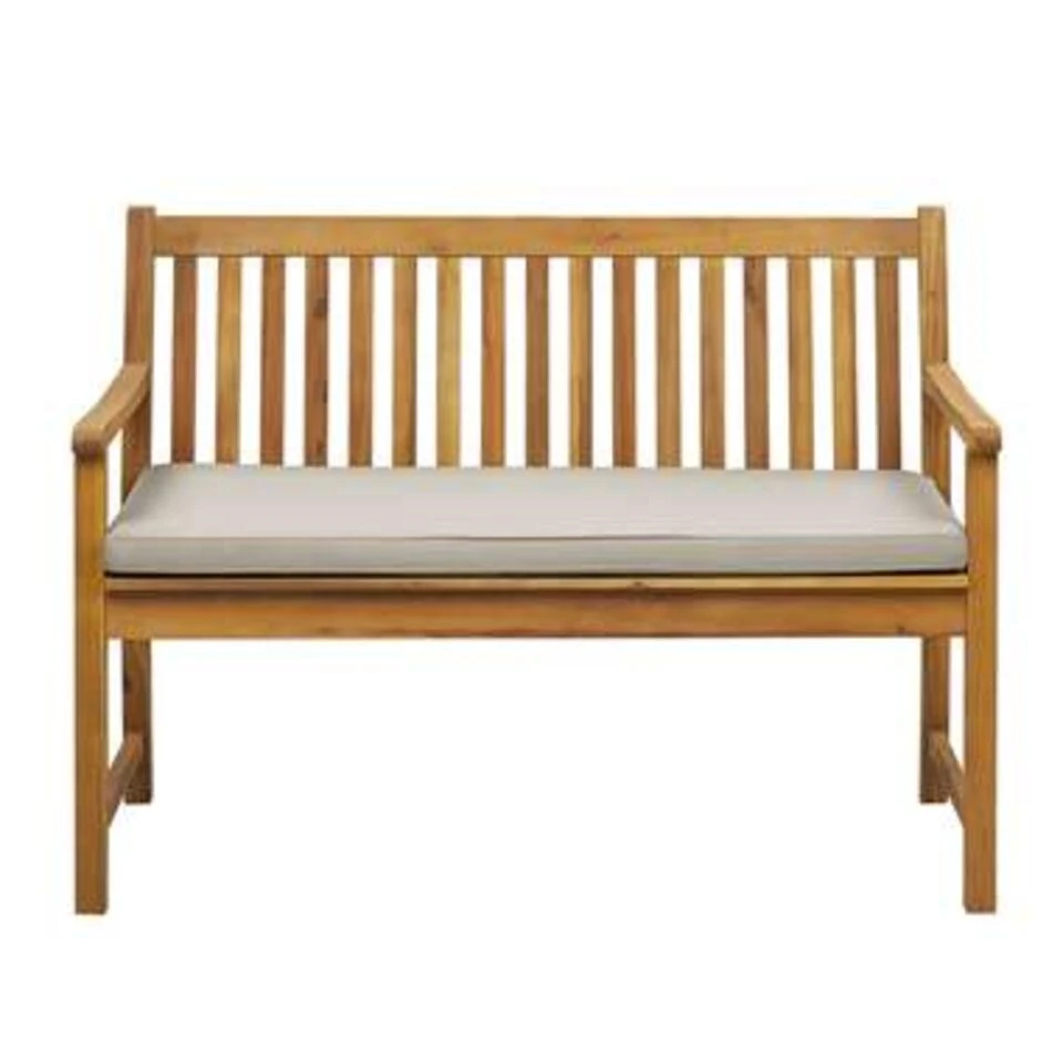 Moderne tuinbank van duurzaam acaciahout met kussen. De bank is gemaakt van zorgvuldig geselecteerd, ecologisch en duurzaam hout. Perfect voor jouw zomertuinfeest of voor een mok warme chocolademelk op een heerlijke herfstmiddag. De bank wordt geleverd met een kleurrijk zitkussen en wordt daarmee een echte blikvanger in jouw tuin.