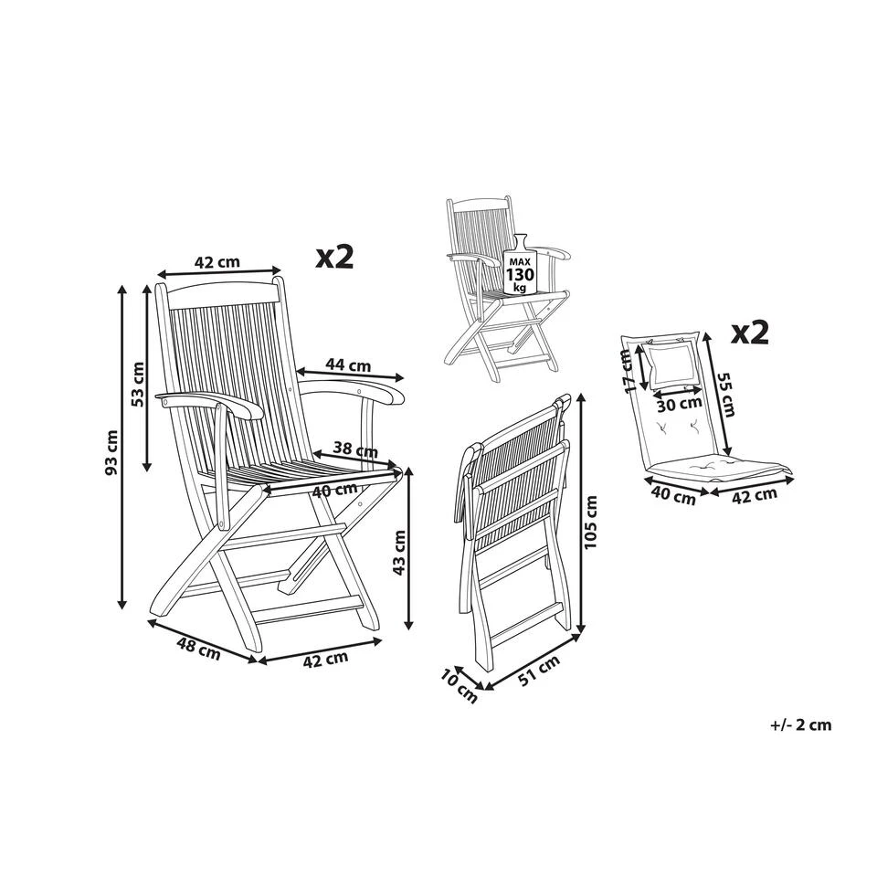 Set van 2 houten tuinstoelen met terracotta kussens. De zetel onder de tuinstoelen. Deze tuinstoelen met comfortabele armleuningen zijn een zeer exclusieve toevoeging aan jouw tuin, terras of balkon. Optimaal zitcomfort en een elegant uiterlijk zijn zeer kenmerkend voor deze set, evenals materiaal van hoge kwaliteit. De brede armleuningen bieden extra comfort. Het mooie acaciahout met zijn warme kleur is onderhoudsvriendelijk. Natuurlijk kunnen de stoelen worden ingeklapt om ruimte te besparen. De extra comfortabele kussens maken deze tuinstoelen een absoluut hoogtepunt. Dankzij de waterafstotende coating zijn de kussens uiterst eenvoudig te reinigen.