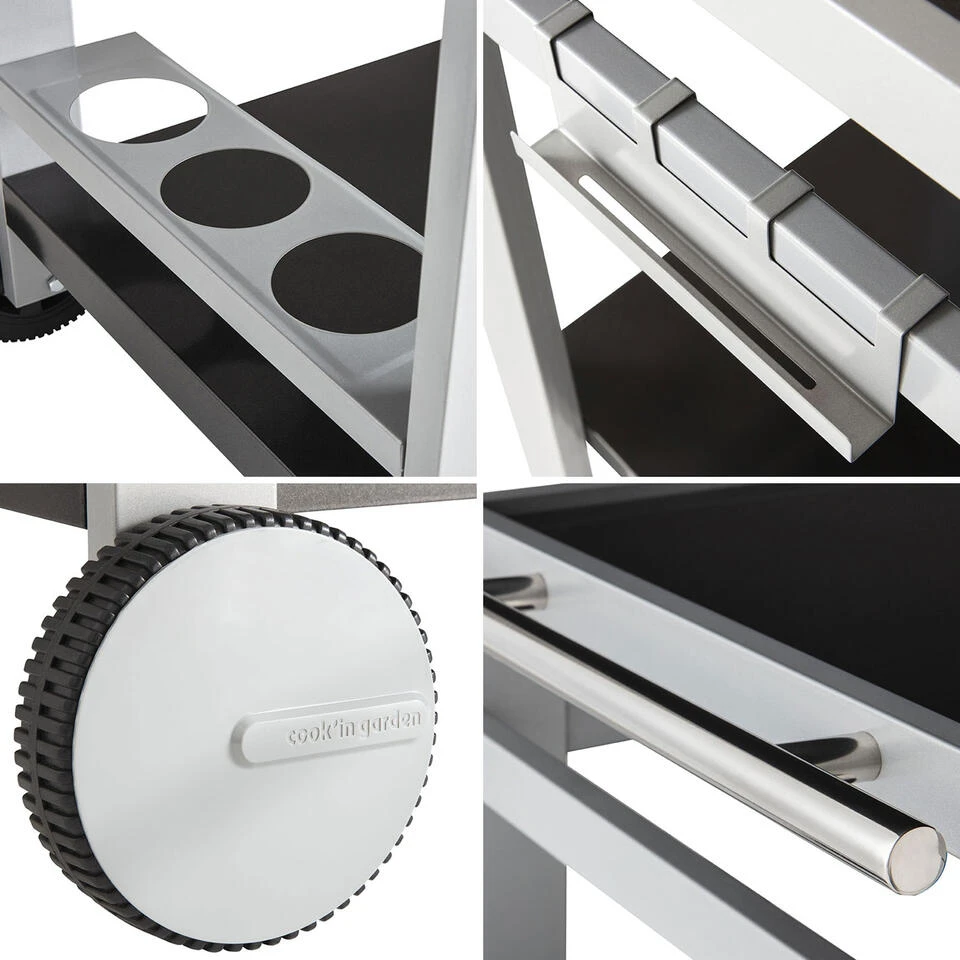 De MEDIA M is ontworpen om uw elektrische of gas bakplaat en al uw kookgerei voor buiten op te bergen. Hij is uitgerust met 4 omkeerbare haken als gebruiksvoorwerpenhouders en 3 flessenhouders. Alles is aanwezig om het opbergen van uw voedsel, serviesgoed en keukengerei te optimaliseren. Hij heeft ook 2 wielen en een handvat om hem gemakkelijk en veilig door uw tuin te verplaatsen.