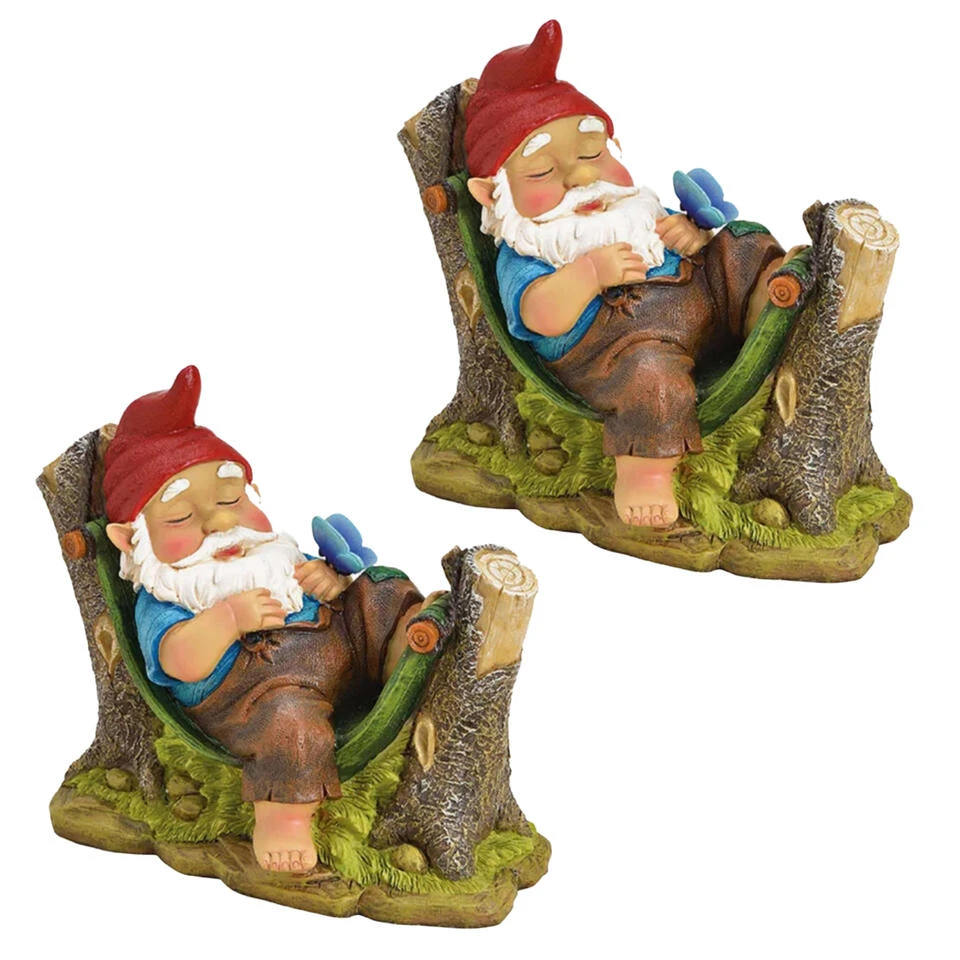 Tuinkabouter slapend in hangmat. Dit tuinkabouter beeld heeft een formaat van ca. 22 x 10 x 18 cm en is gemaakt van polystone. Tuindecoratie/tuinversiering kabouters.