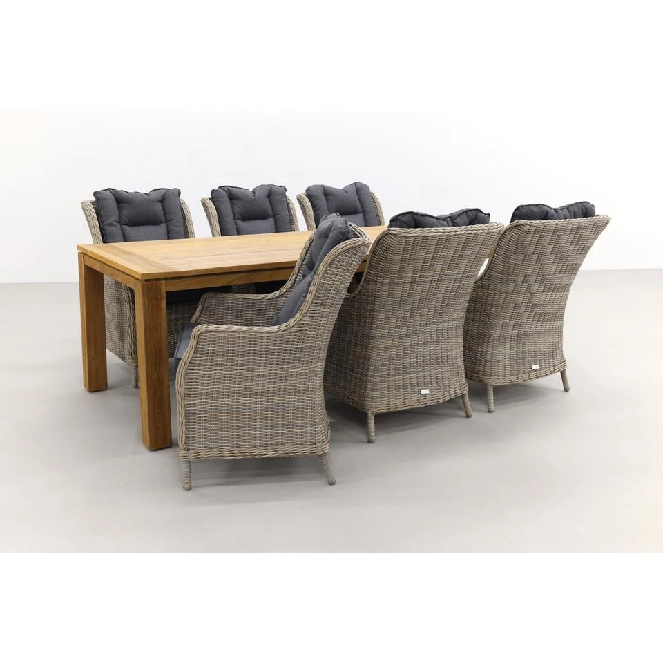 Wil jij graag een comfortabele tuinset met rustieke uitstraling? Dan is dit de juiste tuinset voor jou! De Rome tuintafel combineert perfect bij de wicker Osborne stoelen van Garden Impressions. Door het teakhout samen met het wicker krijg je een stoer randje aan de landelijke uitstraling. De Osborne stoel heeft een comfortabele zit die nog wordt verhoogd door de meegeleverde kussens. Heb je niet genoeg aan 6 zitplaatsen? Je kunt altijd nog 2 zitplaatsen creëren door van de kopse kanten gebruik te maken.