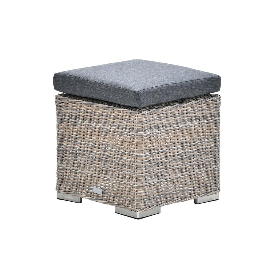 Het krukje is voorzien van een aluminium binnen frame met daaromheen hand gevlochten 6 mm half rond kunststof wicker draad in de kleur vintage willow. Het krukje wordt geleverd met een praktisch texfiber all-weather kussen welke is voorzien van een stevige comfortabele sneldrogende vulling. Het kussen kan gerust buiten blijven liggen bij een regenbuitje en is binnen ongeveer twee uur weer droog. Uiteraard kan het kussen wel smerig worden, maar gemakkelijk maak je deze ook weer schoon met een zacht sopje.