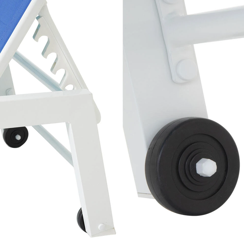 Het is heerlijk relaxen in de zon of in de schaduw van een parasol wanneer de zomermaanden aanbreken. Nog beter is het als u een Textilene ligstoel hebt die u gemakkelijk van het terras naar de tuin en naar de rand van het zwembad kunt verplaatsen. U kunt genieten van uw momenten van ontspanning, zittend of liggend in deze aluminium ligstoel die bestand is tegen buitenomstandigheden, tegen UV en tegen water. Een uitkomst als je op regenachtige dagen vergeten bent hem onder de hoes te zetten! De rugleuning van dit ligbed, verkrijgbaar in blauw en wit, is verstelbaar op 5 niveaus, zodat u de meest comfortabele positie kunt vinden.