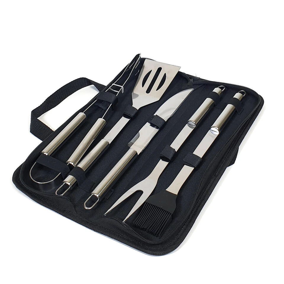 De Krumble 5-delige barbecue set met stoffen tas is 38.5 bij 12 bij 5 centimeter en de hele kit weegt minder dan een kilo. Daardoor is deze set dus erg draagbaar en ideaal voor op vakantie. De uitgebreide set bevat echter wel alle belangrijkste gereedschappen en benodigdheden voor de BBQ die je je kan indenken. De tas bevat onder andere een stalen spatel, een lange stalen vork, een scherp rvs mes, een stalen barbecuetang en een siliconen borstel.