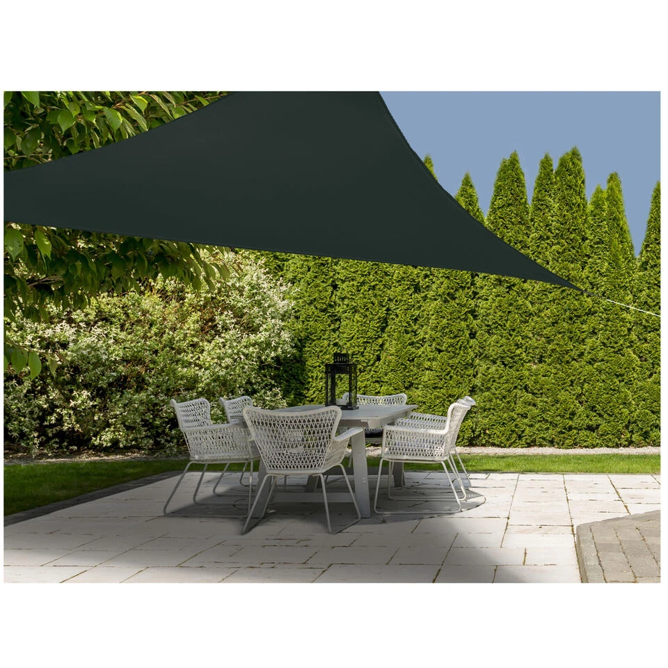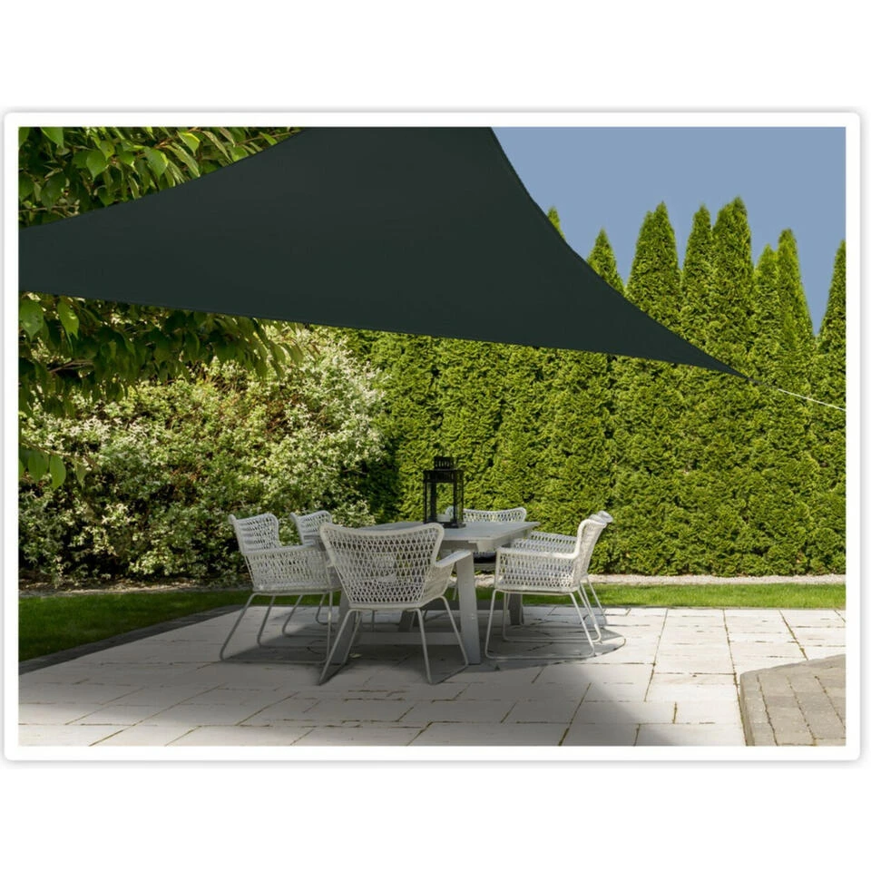 Schaduwdoek/zonnescherm/zonwering driehoek donkergrijs 3,6 meter. Een donkergrijze schaduwdoek, ideaal om een schaduwplek te creeren in uw tuin. Deze schaduwdoek heeft een afmeting van 3,6 x 3,6 x 3,6 m en een driehoekige vorm. De schaduwdoek biedt bescherming tegen UV-straling en is waterproof. Wordt geleverd met drie touwen van 230 cm per stuk zodat u deze eenvoudig aan bijvoorbeeld uw schutting kunt bevestigen. Materiaal: 100% polyester. Schaduwdoeken/zonnezeil/zonnedoek/zonwering tuin artikelen en accessoires.
