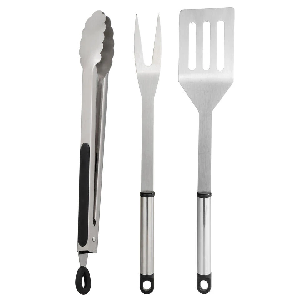 BBQ/barbecue gereedschap set 3-delig RVS. Roestvast stalen gereedschap set voor op de barbecue bestaande uit een tang, vork en spatel.
