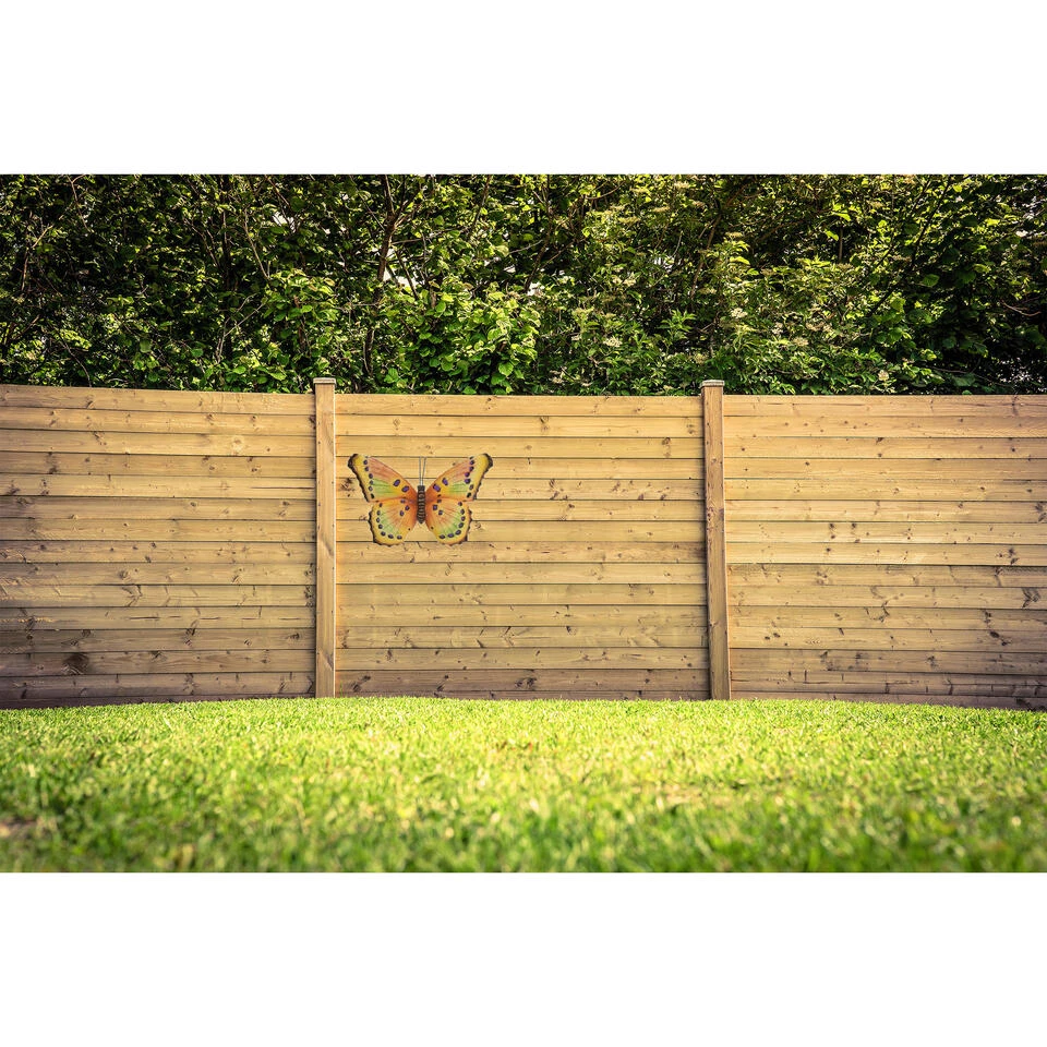Een gele met paarse vlinder, geschikt voor decoratie in uw tuin of aan uw schutting. Met ophangoogje. Afmeting: ca. 35 x 24 cm. Materiaal: metaal. Tuindecoratie muur/schutting ophang vlinders van metaal.