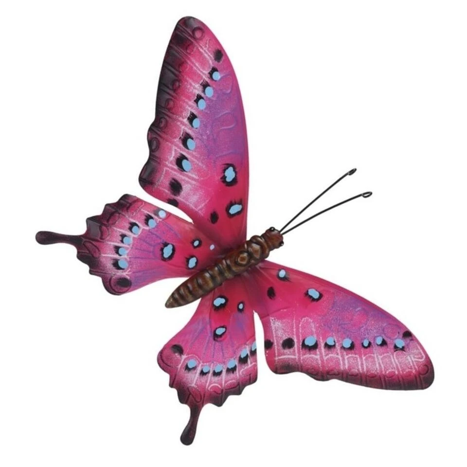 Een roze met lichtblauwe vlinder, geschikt voor decoratie in uw tuin of aan uw schutting. Met ophangoogje. Afmeting: ca. 44 x 31 cm. Materiaal: metaal. Tuindecoratie muur/schutting ophang vlinders van metaal.
