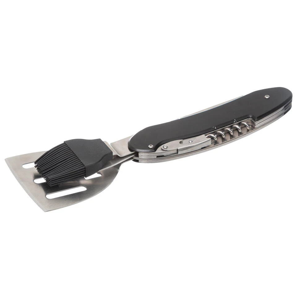 BBQ/barbecue gereedschap set 5-in-1 Zwitsers zakmes 30 cm. Roestvrij stalen 5-in-1 gereedschap set voor de barbecue bestaande uit een spatel, vork, kwast, kurkentrekken en flesopener. Materiaal: roestvast staal. Formaat: 30 x 9 x 3 cm. Kleur: zilver/zwart.
