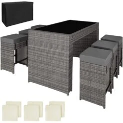 Met deze elegante wicker bar-set maakt u uw tuin, balkon, terras, lounge of serre, tot een absolute highlight. De tafel en barkrukken zijn gemaakt van aluminium en bekleed met wicker. Hierdoor is het gewicht gering, zonder dat er ingeboet wordt op de stabiliteit. Het glazen tafelblad ziet er heel stijlvol uit en is heel gemakkelijk te reinigen. De zeer comfortabele zitkussens gemaakt van polyester zijn qua kleur precies afgestemd op de wicker barset. Op de achterkant zijn deze voorzien van een ritssluiting, zodat de overtrekken er gemakkelijk kunnen worden afgehaald voor reiniging.Om de kussens te beschermen tegen vochtigheid en water, is het oppervlak geïmpregneerd. Zo rollen vuil- en waterdruppels er eenvoudig af (zie afbeelding).