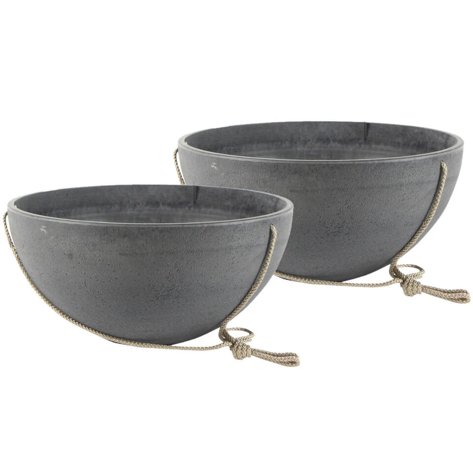 Hangende bloempot/plantenpot schaal van gerecycled kunststof en steenpoeder in de kleur donkergrijs met diameter 35 cm en hoogte 17 cm. Potten voor kamerplanten, buitenplanten of kunstplanten. Deze plantenpot voor buiten heeft een stijlvolle uitstraling in elk interieur. Een unieke duurzame mix van materialen dat nu geen afval is, maar een prachtige duurzame bloempot. Een sterke, mooie pot met ophang touw die vriendelijk is voor het milieu en de portemonnee. Deze serie potten hebben een eigen drainagesysteem onderin de pot.