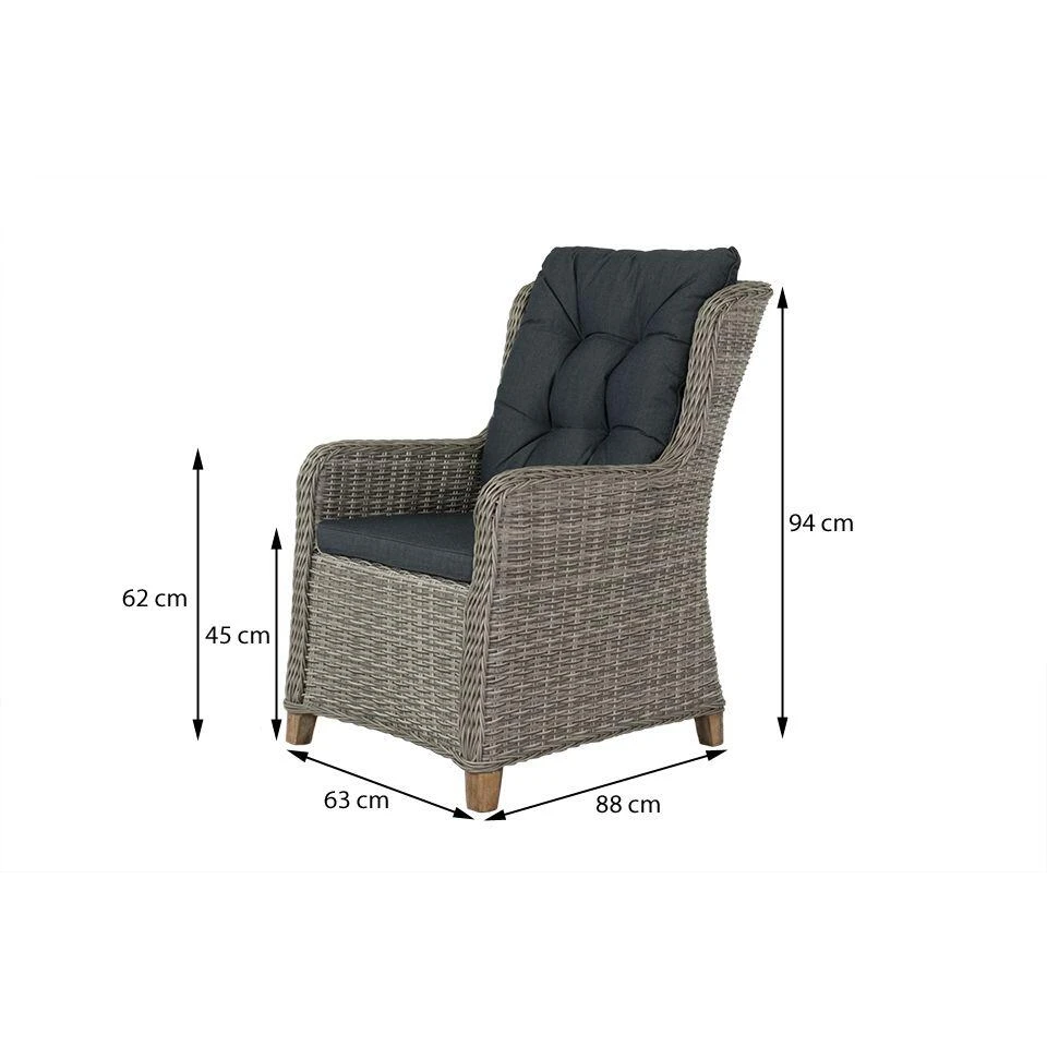 De Torino tuinstoel is gemaakt van hoogwaardige materialen en heeft een hoog zitcomfort. De wicker tuinstoel is uitgerust met een zit- en rugkussen. Het rugkussen is gecapitonneerd waardoor de tuinstoel een luxe uitstraling krijgt. Het frame van de Torino tuinstoel is gemaakt van stevig aluminium. Dit materiaal is licht in gewicht, onderhoudsarm en heeft een lange levensduur. Om dit frame is het halfronde wicker gevlochten. Het wicker is uitgevoerd in de kleur paloma grijs en is het beste te beschrijven als een mix van grijstinten.