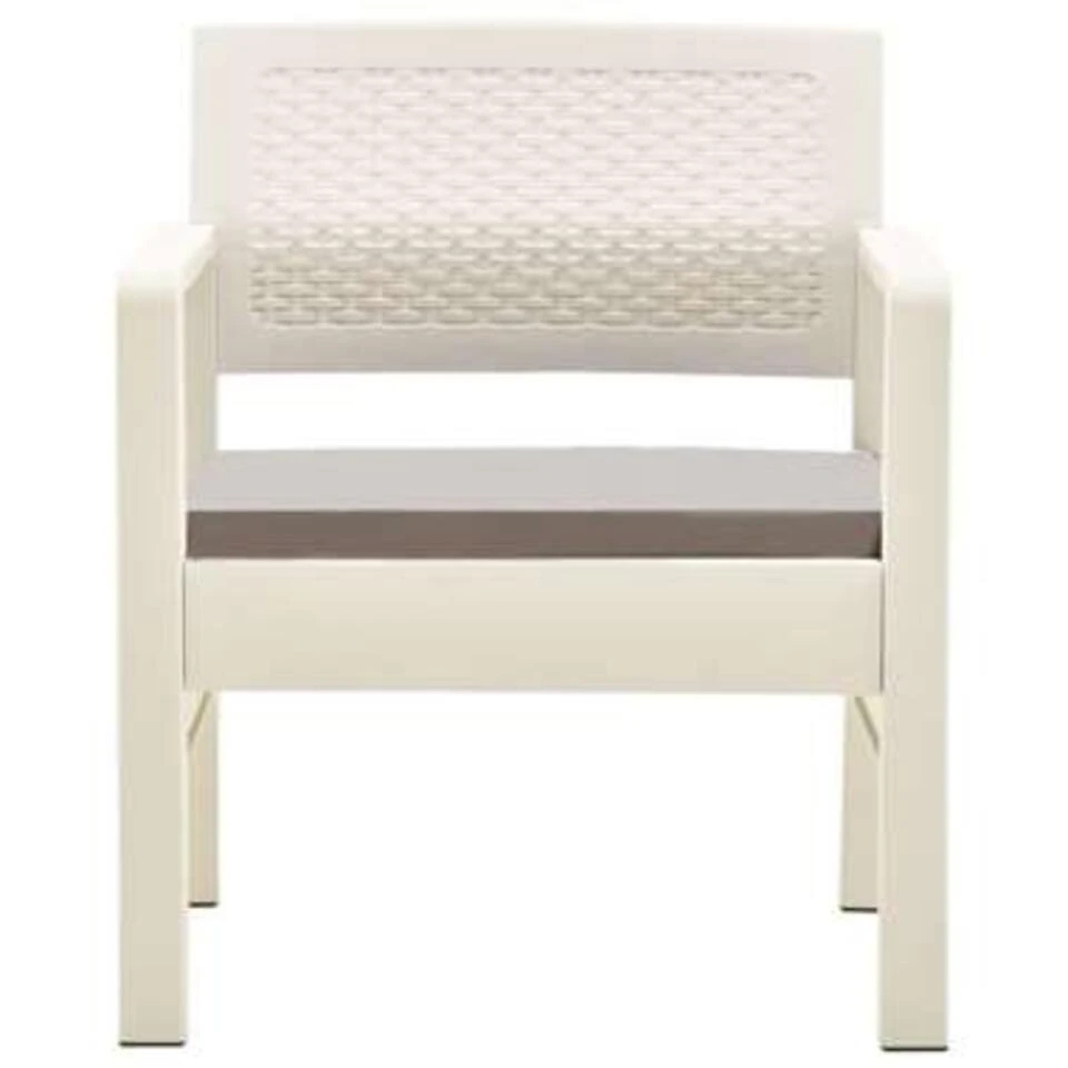 Deze loungeset is geschikt voor buitengebruik dankzij zijn massieve maar toch lichtgewicht kunststof materiaal, dat duurzaam, weerbestendig en gemakkelijk te reinigen is. De zitkussens, gemaakt van polyester, dragen bij aan het comfort van de armstoelen. De tuinmeubelset is eenvoudig te monteren.
